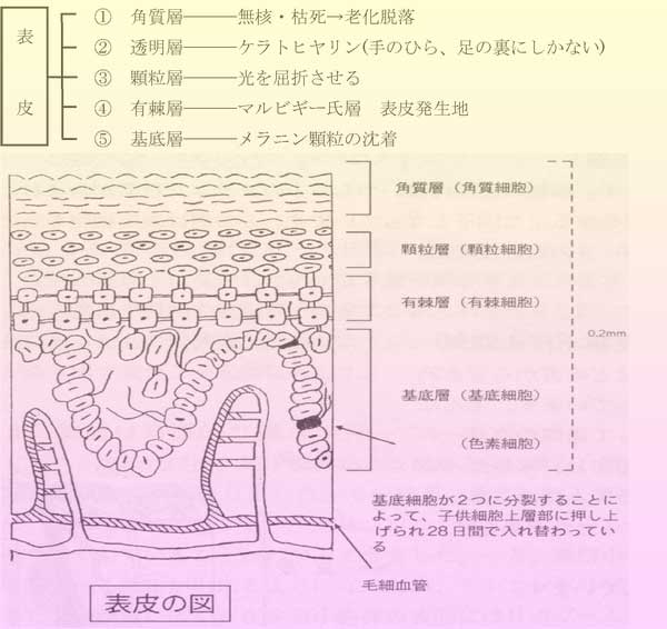 | ハ) | 表皮の構造 表皮は、たくさんの重なりあった表皮細胞からできています。その細胞は表皮の深部から 新生され、だんだん表層へ向かって成長し押し上げられて、遂には角質化していわゆる垢の 一成分となり剥がれ落ちます。この時メラニン色素も排出されます。 このように、細胞が生育していく間に同じ時期にできた同型の細胞群は、表皮の基底から 表面までの間に数個の細胞の層を成し、どの層もそれぞれの重要な役割を果たしています。 |